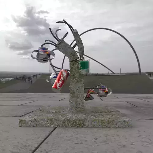 A conceptual 3D asset representing a fusion of industrial decay and nature. The model features a weathered reinforced concrete trunk with exposed rusty rebars and crushed aluminum cans repurposed as blooms. Perfect for post-apocalyptic, urban, or modern art scenes.
