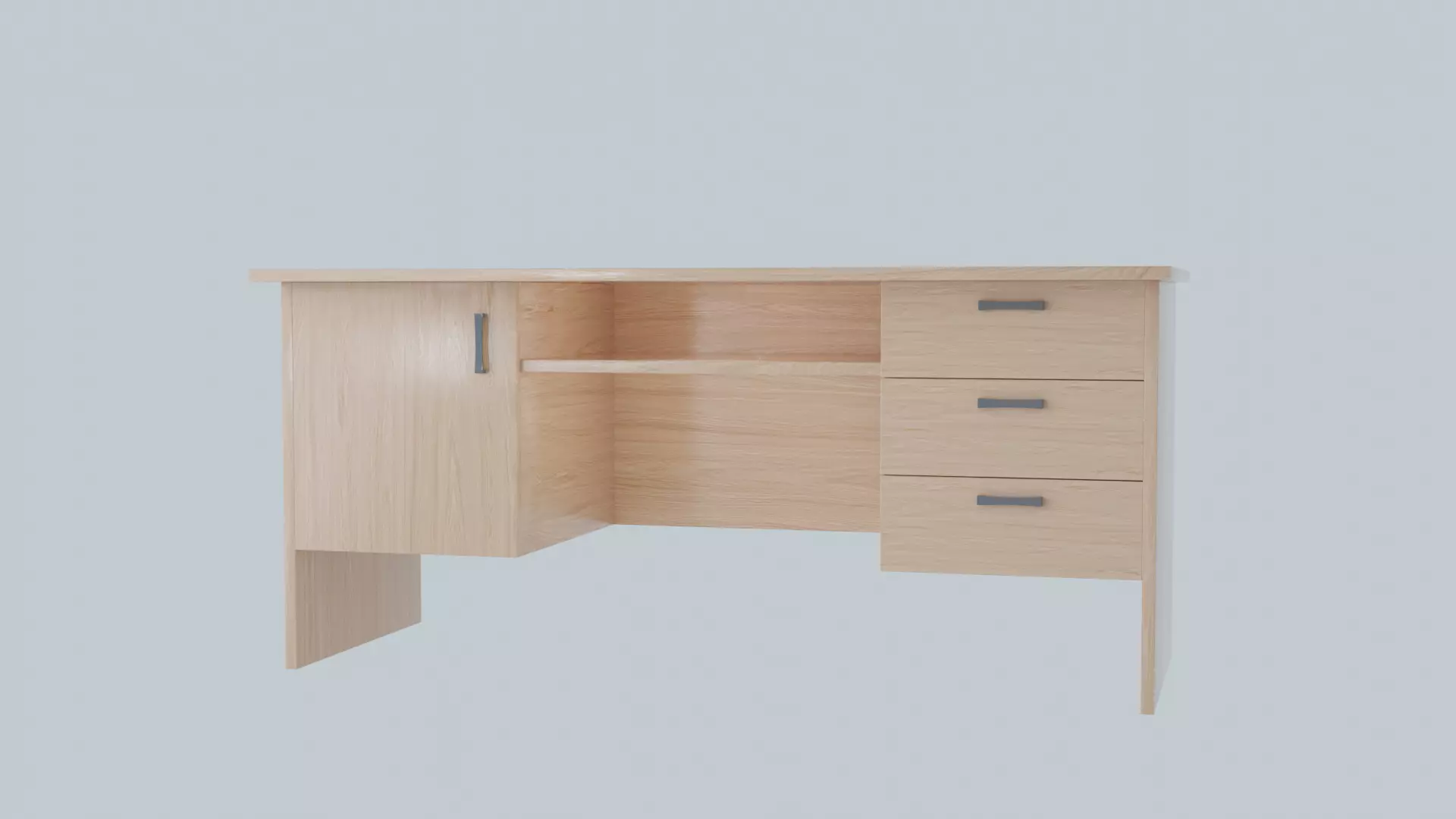 Description:A simple yet functional desk in a modern style. The desk is made of light wood with a natural oak texture. It features three pull-out drawers with matte black handles for convenient storage. On the left side, there is a cabinet with a door for storing documents or other items. An open shelf under the tabletop adds practicality and extra space for organizing essentials.