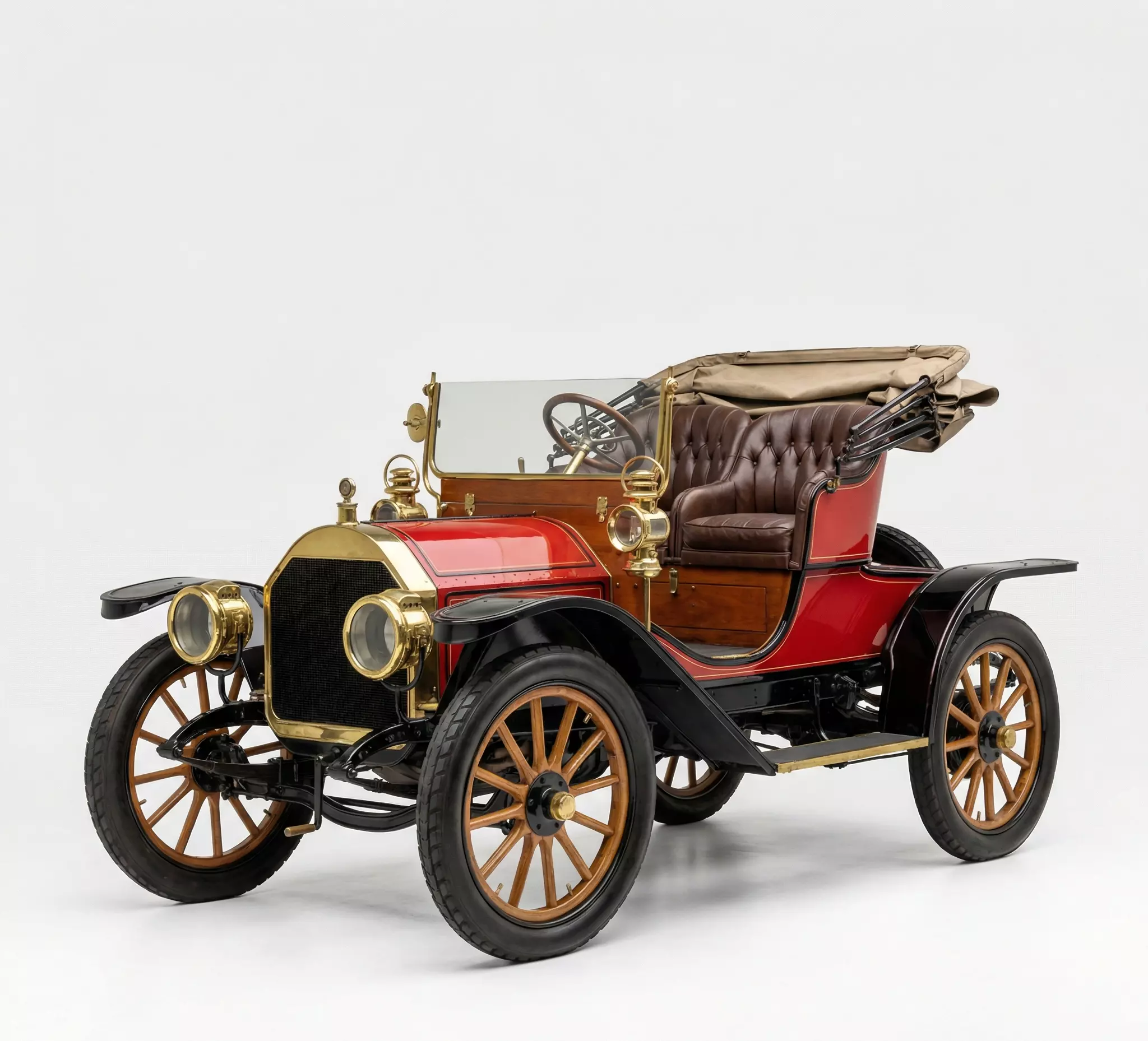 This exquisite 3D model captures the dawn of the automotive age with a highly detailed recreation of a Brass Era touring car from the early 1900s. The model features a striking vibrant red body with gold pinstriping, contrasted by elegant black curved fenders and a luxurious tufted brown leather interior. True to the period, the vehicle is adorned with polished brass accents, including the iconic oversized radiator shell, side-mounted carriage lamps, and a detailed brass steering column. Intricate mechanical details such as the wooden artillery-style wheels, leaf spring suspension, and the folded-down canvas convertible top add layers of authenticity. This asset is masterfully crafted for historical reconstructions, high-end architectural visualizations, or cinematic period pieces, embodying the transition from horse-drawn carriages to the modern automobile.