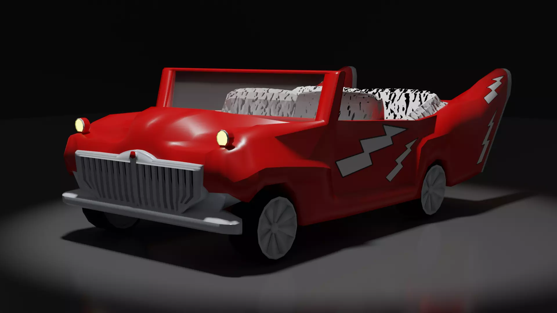 Designed to be reminiscent of the Ford Deluxe Convertible Greased Lightning shown in the movie Grease during the fantasy segment of the Greased Lightning song, complete with a red finish and white lightning bolts.This my interpretation of the Greased Lightning car but keeps similar features to the original such as the oversized grille, plethora of lightning bolts, and prodigious wings protruding from the back of the car.In this car, you're bound to turn heads in your next drag-race.
