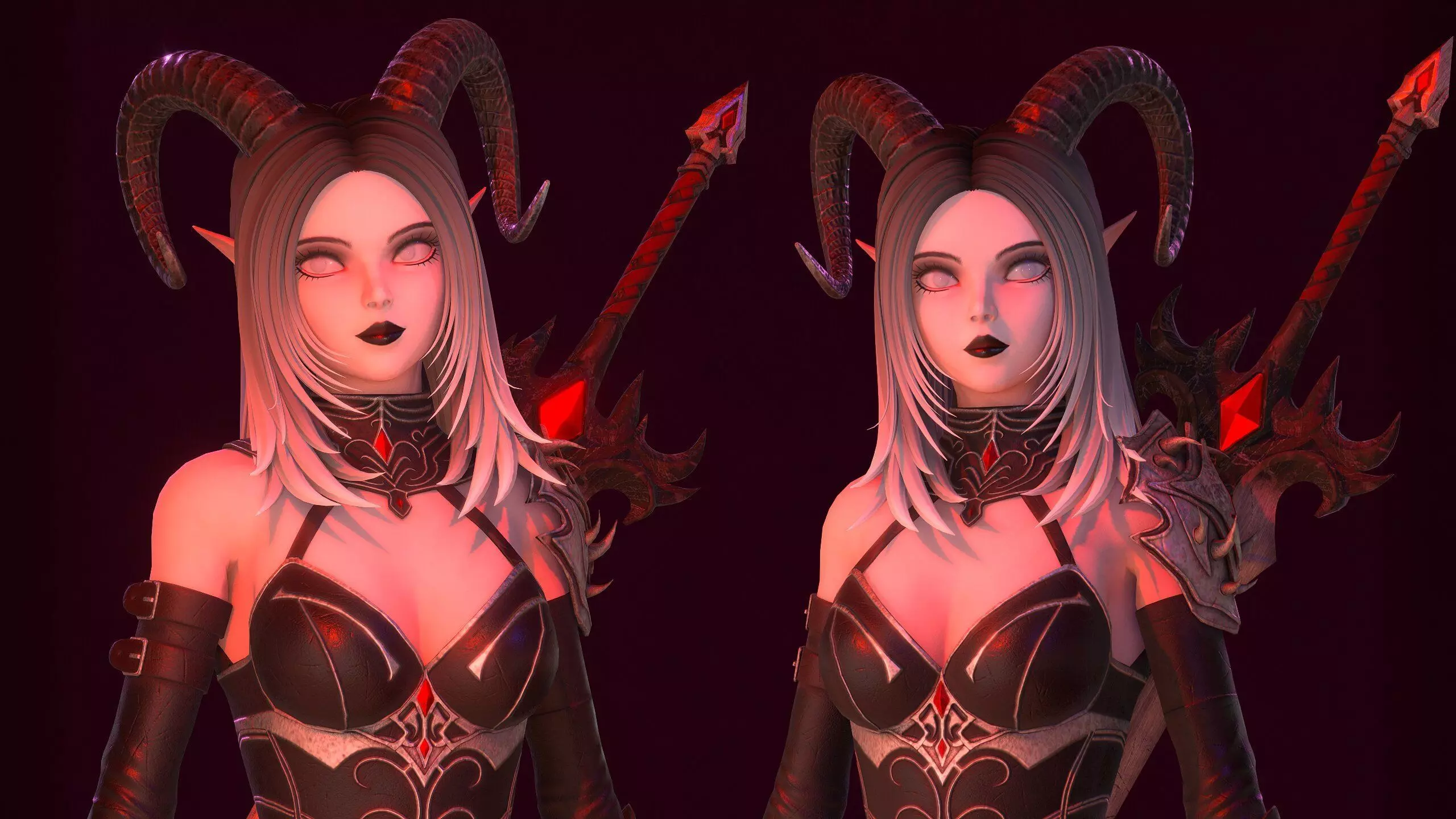 Stylized Daemon female character designed for cinematics, animation, and real-time projects. Includes detailed armor, demonic sword, and rig system (Rigify) with extra controls for eyes and hair.