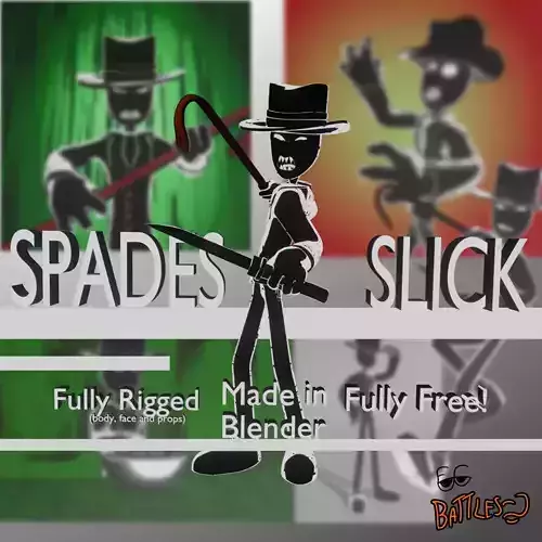 So I was thinking on project ideas to do next, and i thought... Since My last uploads were 3 original characters, I decided this time to try doing a character that already exists, something that I almost never do. So I went on looking for more obscure franchises that might not have 3D models made, and found just what I was looking for: Spades Slick, from Andrew Hussie's Homestuck.I have to admit, I was a bit astonished that Spades didn't have any 3D models made of him, considering he's one of the most popular characters of the comic, but still I went right to work as soon as I picked the target. Character is fully rigged, including the 2 weapons, the body and the face. My first facial rigging too! I'm putting this model completely free, provided credit is given of who made it. Also you can't use it for commercial purposes, for obvious reasons.MODEL WAS MADE IN BLENDER WITH BLENDER'S SHADING NODES. I CAN NOT GUARANTEE THE MODEL WILL WORK THE SAME IN OTHER ENGINES.