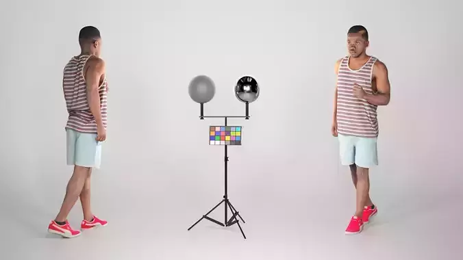 This is a true human size and detailed model of a sporty handsome young man of African appearance. The model is captured in casual pose to be perfectly matching for variety of architectural visualizations, e.g. beach, jogging track, gym, park, VR/AR content etc.