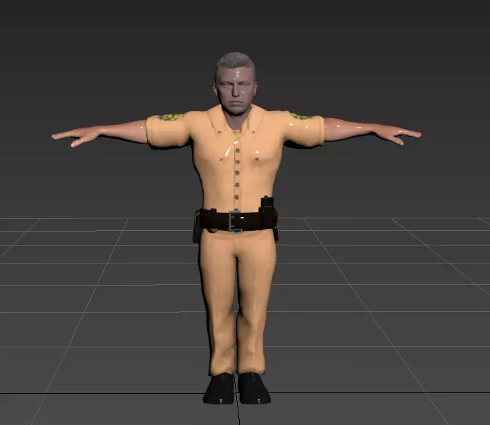 The 3D model of a policeman showcases a detailed uniform, including a badge, belt, and hat, reflecting an authentic appearance. With a realistic posture and expressive facial features, it adds life to animations or simulations. Ideal for use in gaming, training programs, or visual storytelling projects.