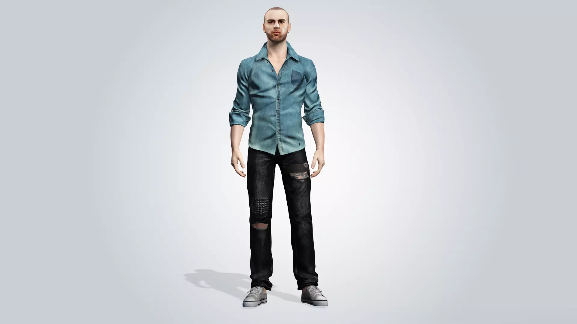 a 3D-rendered male character standing in a neutral pose against a plain, light gray background. The character has a bald or closely shaved head and a short beard. He is wearing a teal button-up shirt with the sleeves rolled up and black distressed jeans that have multiple rips and patch details, especially on the left leg. The outfit is completed with a pair of light gray sneakers. The character has a casual and slightly edgy look, and the overall render has a high level of detail and realism.