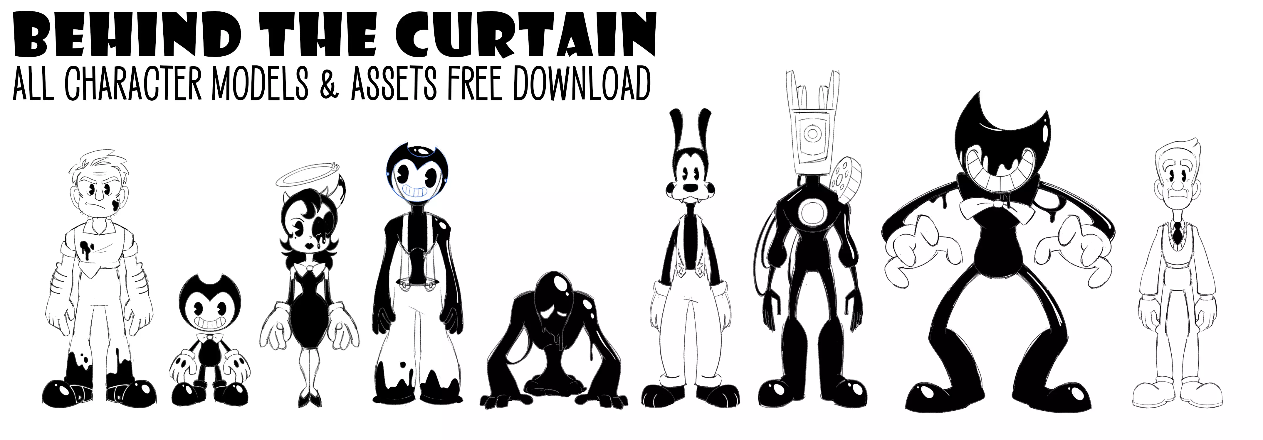 This bundle, expertly put together by our 3-D Animation Supervisor Ewa Różańska, includes the models, textures, and 2-D animation assets used in the production of the musical extravaganza, Behind The Curtain! The Character models are named for those who wish to do their own AU's and fun stories alike: The Animator (Henry Ross), The Angel (Vivian Hayworth), The Projector (Ub Leesworth), The Killer (Sam Bogart), Small and Large editions of The Demon, The Director (Max Escher), and The Lost Souls. 3-D assets include a heart, rope (cut and in-tact), and bullet casings for a Thompson machine gun. 2-D assets include all poster artwork, silhouettes, character turnarounds, animator drawings, flashback illustrations, and a high-pressure pipe burst spray.