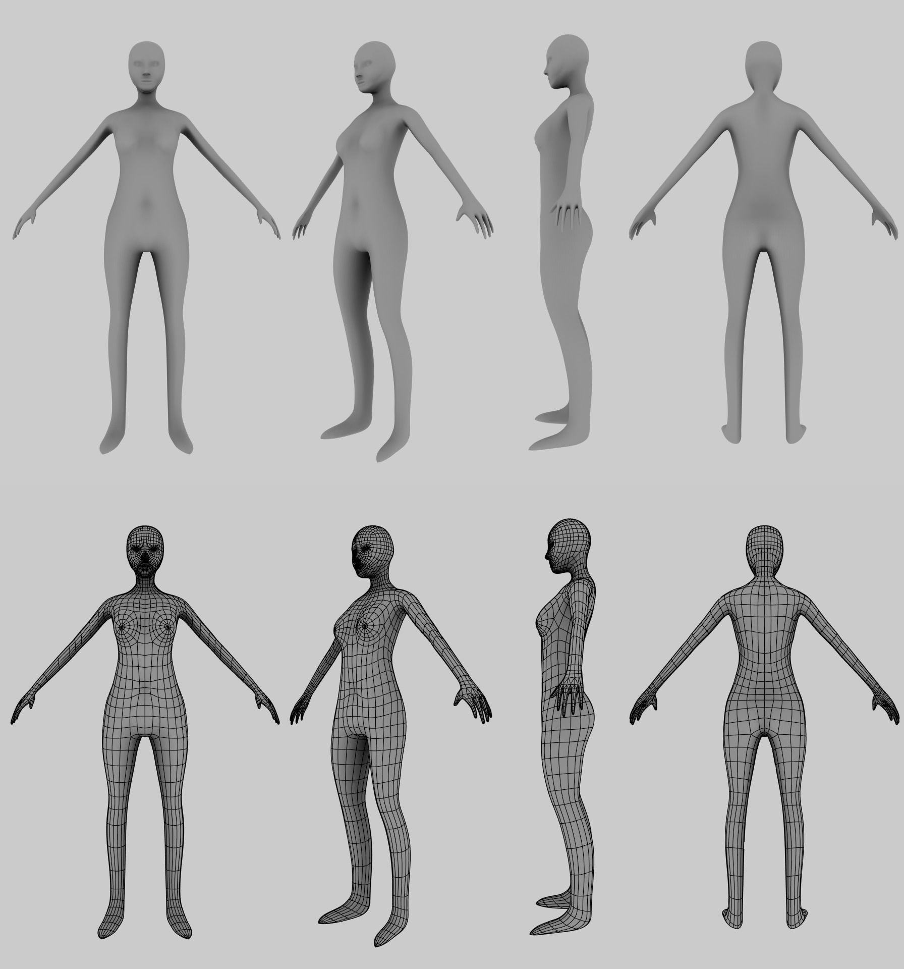 Lowpoly female model, basic, has the basic shapes for a 3D model.