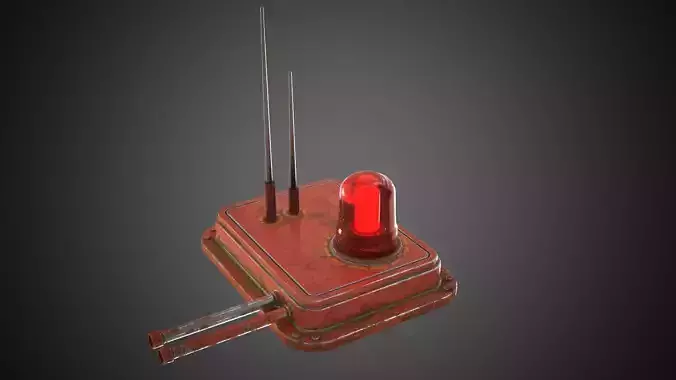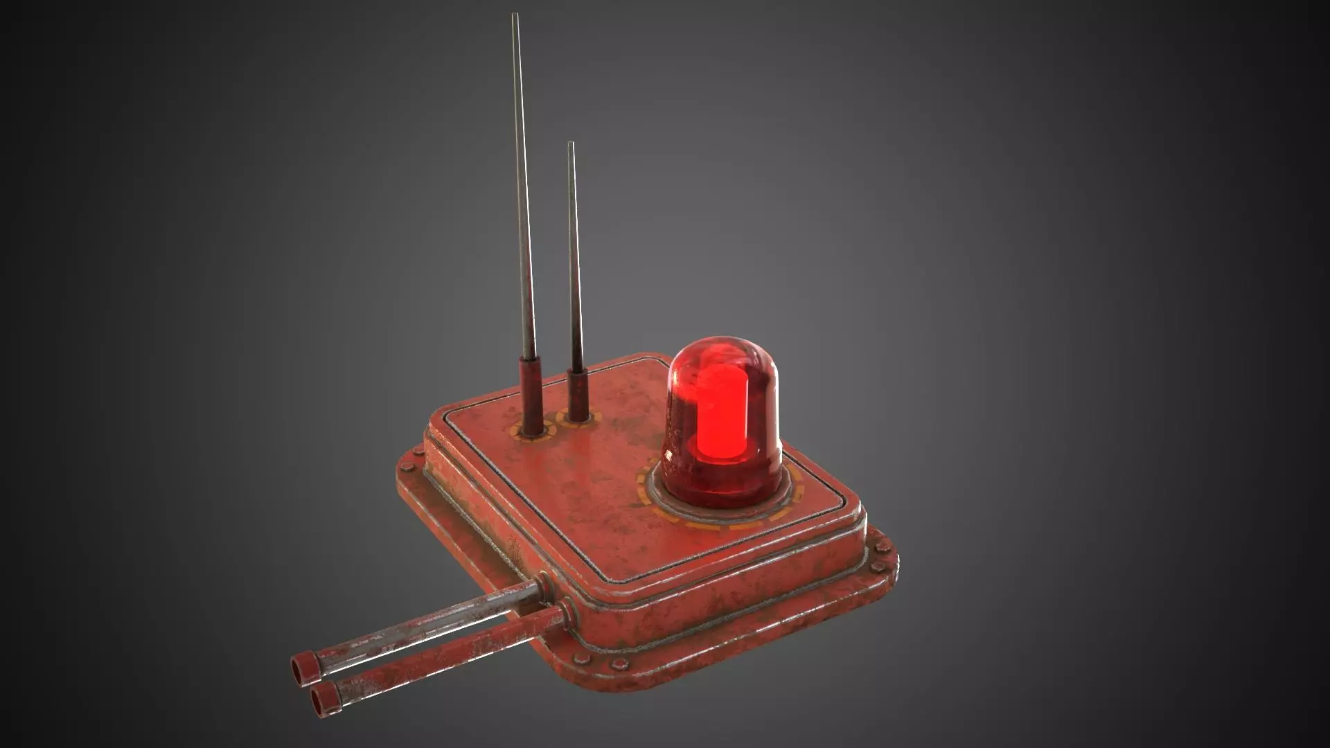 sci-fi industrial signal lamp with an installation panel, connection to electricity and a wireless control system. The worn red steel casing adds character over time. The model has PBR materials and textures in size 2048x2048px.