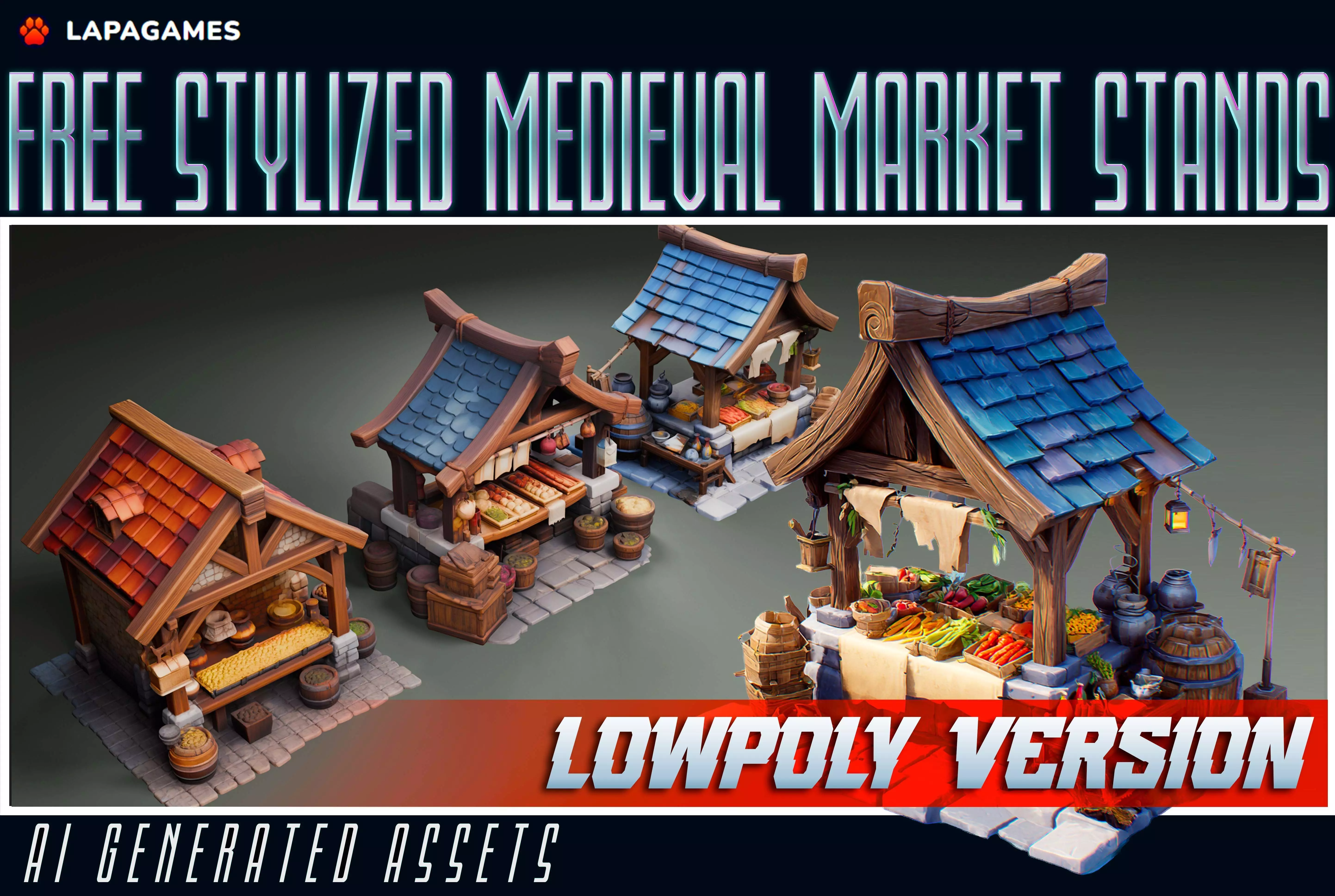 Multiple stylized medieval market standsLow-poly environment props optimized for real-time useStrong silhouettes and readable shapesRich fantasy-themed details (wood, cloth, food, barrels)Clean and efficient topologyAI-assisted hand-polished workflowStylized PBR texturesBlender (.blend) format includedCompatible with Unity, Unreal Engine, Godot & BlenderIdeal for desktop, mobile & indie games100% Free asset pack