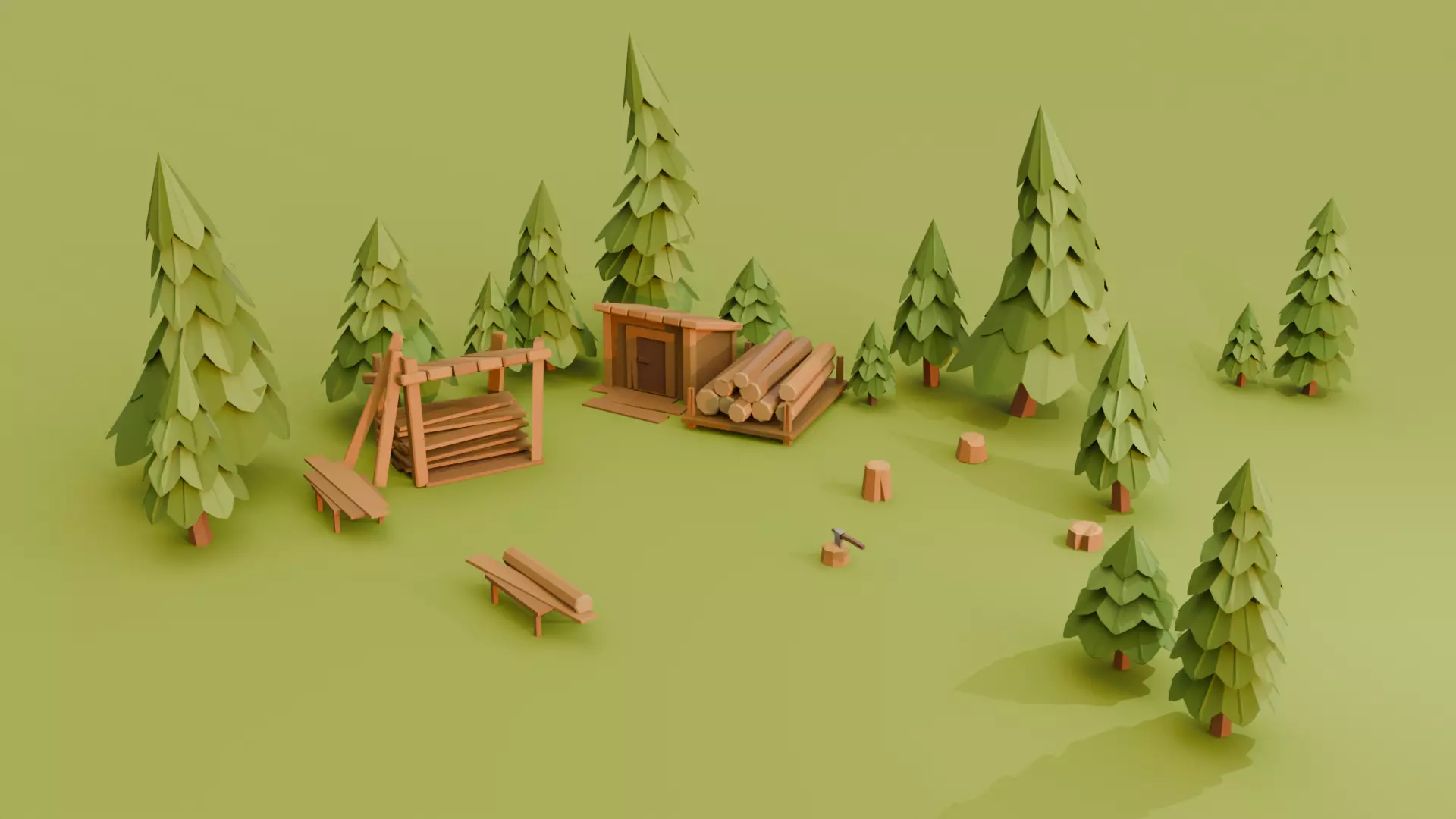 A stylized low poly forest lumber camp scene, perfect for games, animations, mobile projects, VR/AR, and visualizations.This pack features a cozy woodland environment including pine trees, wooden cabins, log stacks, benches, tree stumps, and small props, all designed with clean geometry and optimized topology.