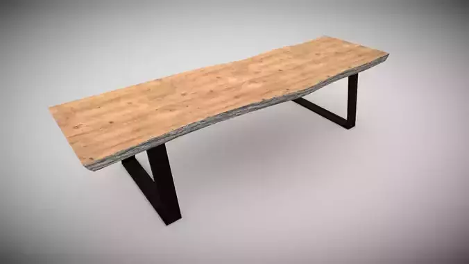 This is a modern, rustic-style table featuring a live-edge wooden top with a natural finish. The surface showcases the wood's natural grain and texture, adding a warm and organic feel. The table is supported by sturdy black metal legs in a sleek, angular design, creating a stylish contrast between industrial and natural elements. Ideal for dining or workspace settings, this table combines functionality with aesthetic appeal.