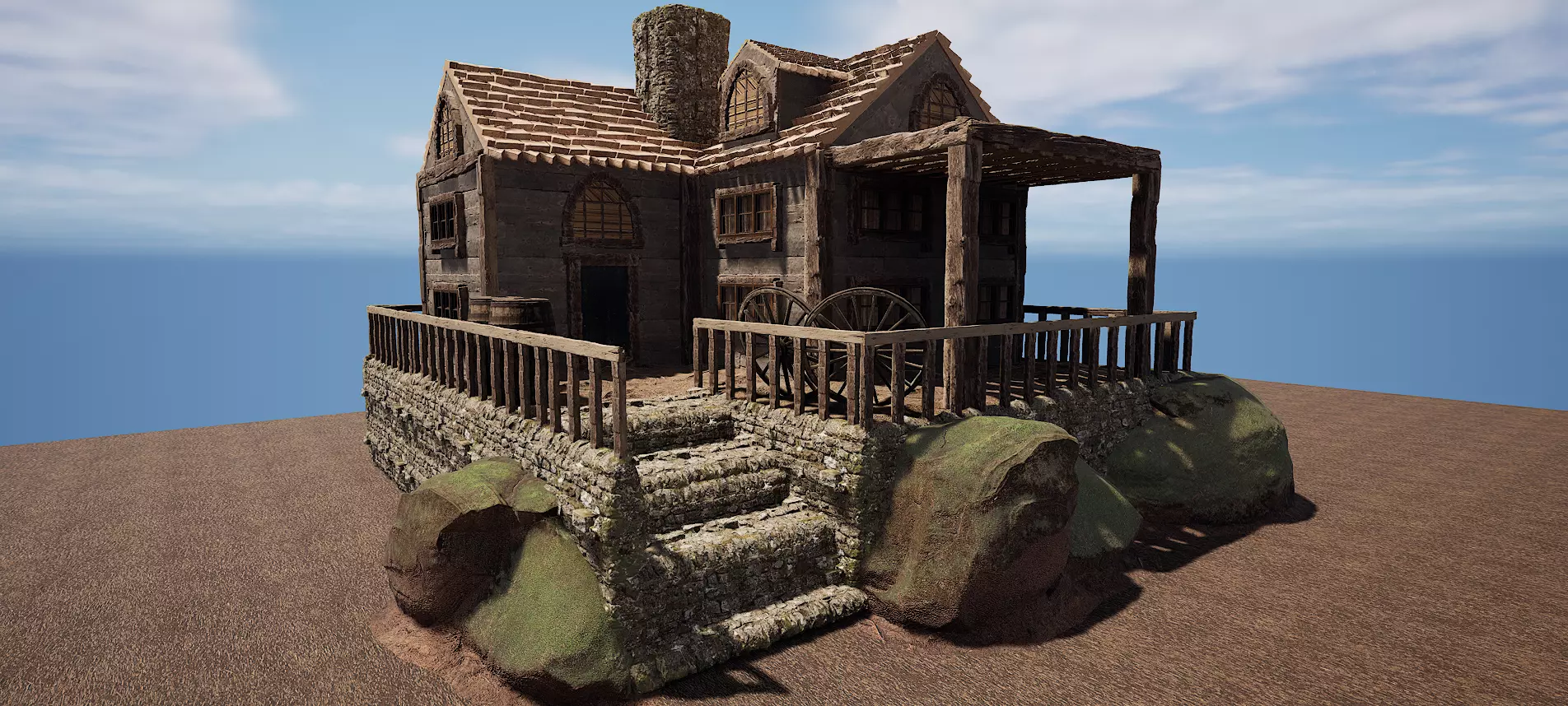 2. Exterior Elements: • A stone staircase leads to the raised wooden veranda, supported by stone foundations. • Moss-covered rocks are integrated into the base, blending the house into a natural environment. • The veranda railing adds architectural interest, while the water wheels mounted on the side of the house evoke a historical mill-like function.