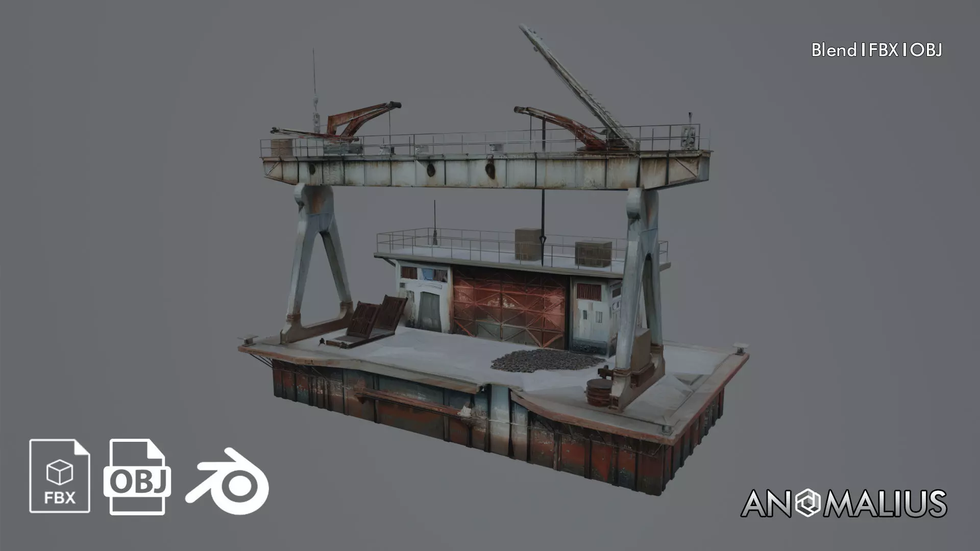 An industrial offshore platform featuring a weathered crane structure mounted above a compact utility building. The asset includes detailed rusted metal surfaces, railings, ladders, and mechanical elements, creating a realistic abandoned maritime look. Designed with optimized geometry, it is suitable for low–mid detail environments such as games, simulations, or background scenes. Ideal for harbor, oil rig, or post-apocalyptic settings.