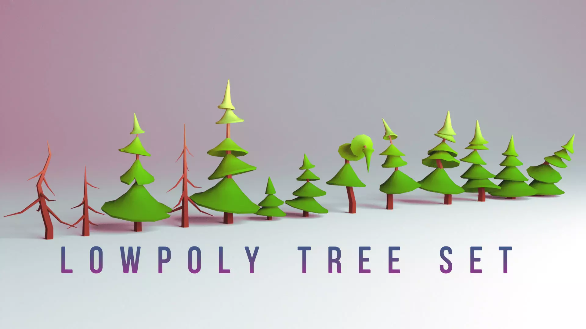 Set of low poly trees, contains 10 models of spruces and 3 dead spruces with 8 different gradient colors. You can easily change colors, Take UV's move it and color is changed)