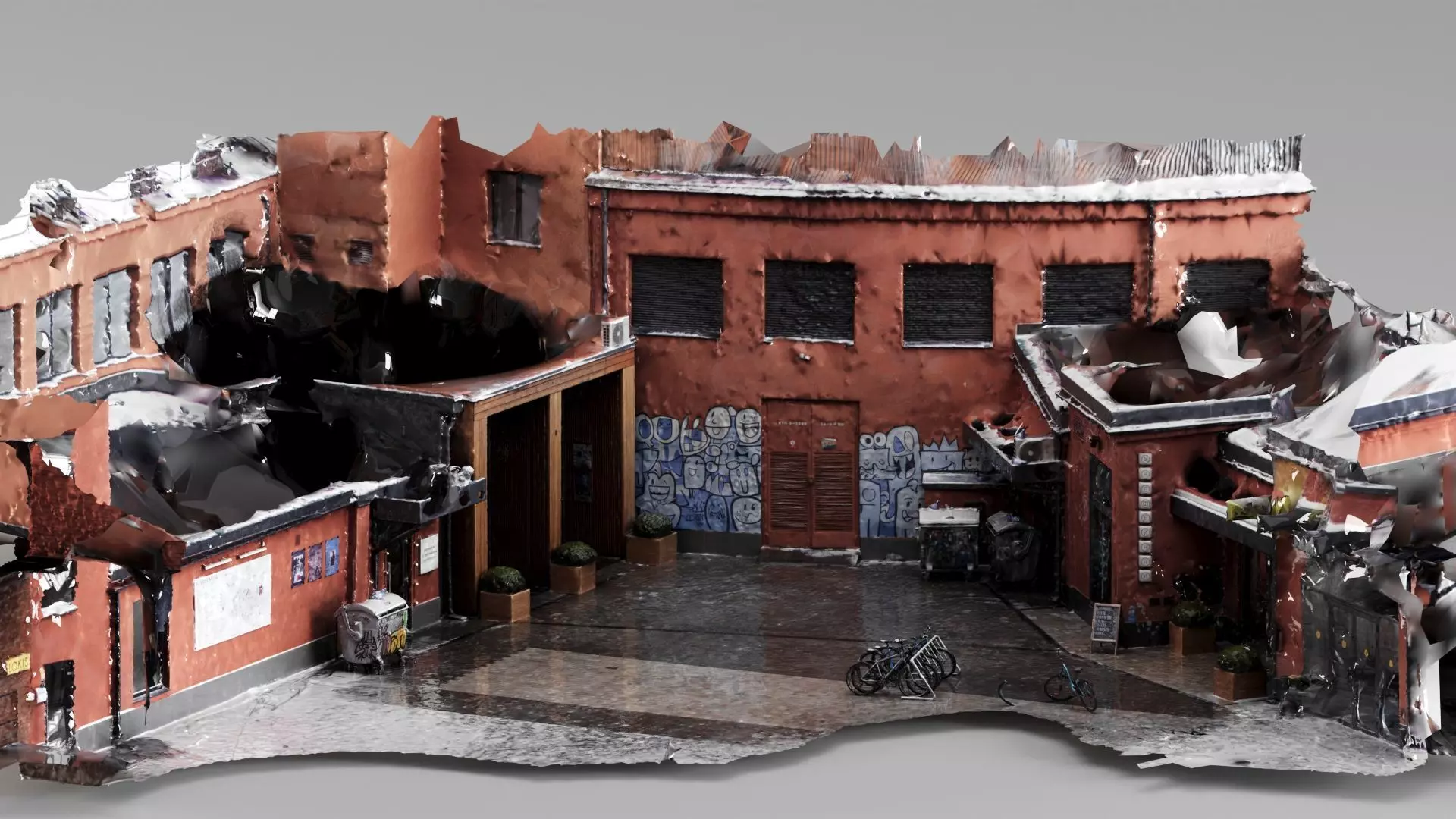 This 3D scanned model captures a weathered, graffiti-covered urban courtyard with red brick walls, metal shutters, scattered bikes, and realistic textures. The scene includes various urban elements like trash bins, signage, wall art, and architectural damage, making it a perfect asset for games, films, or architectural visualization where authenticity is key.