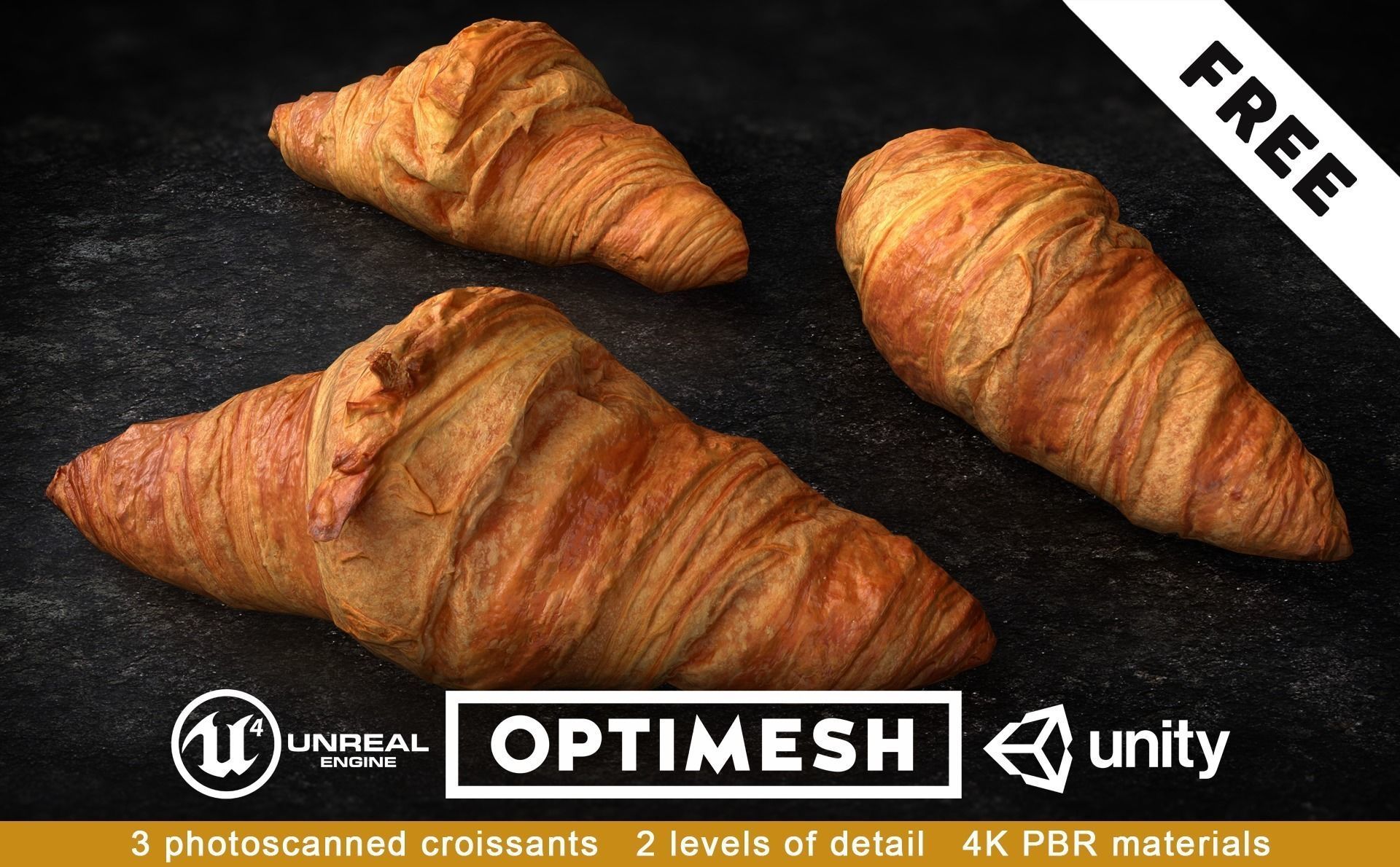 This pack consists of 3 FREE CROISSANT 3D MODELS out of over 30 baked pastries in our offer.We want to share these models with you as a sample of the OPTIMESH quality and precision.If you are hungry for more free high quality 3D models, be sure to find OPTIMESH on Facebook.Artists who will share works in which they used our assets will be granted discount coupons!