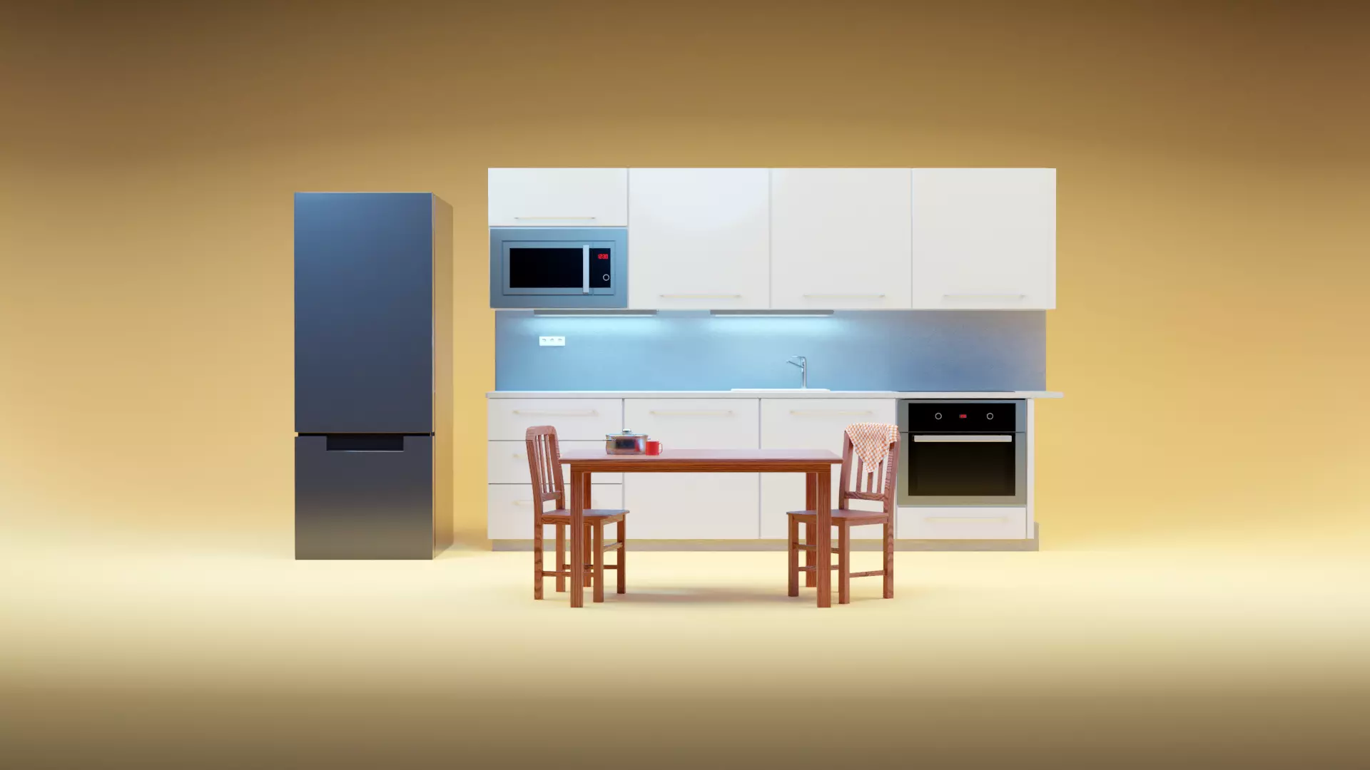 - One of the 9 formats: abc, blend, dae, fbx, glb, obj, (including mtl), ply, stl and x3d. - Each format contains 3 parts: Chair (with a towel), the actual kitchen and table. - These don’t contain the lighting, cameras or the floor, but only the furniture.