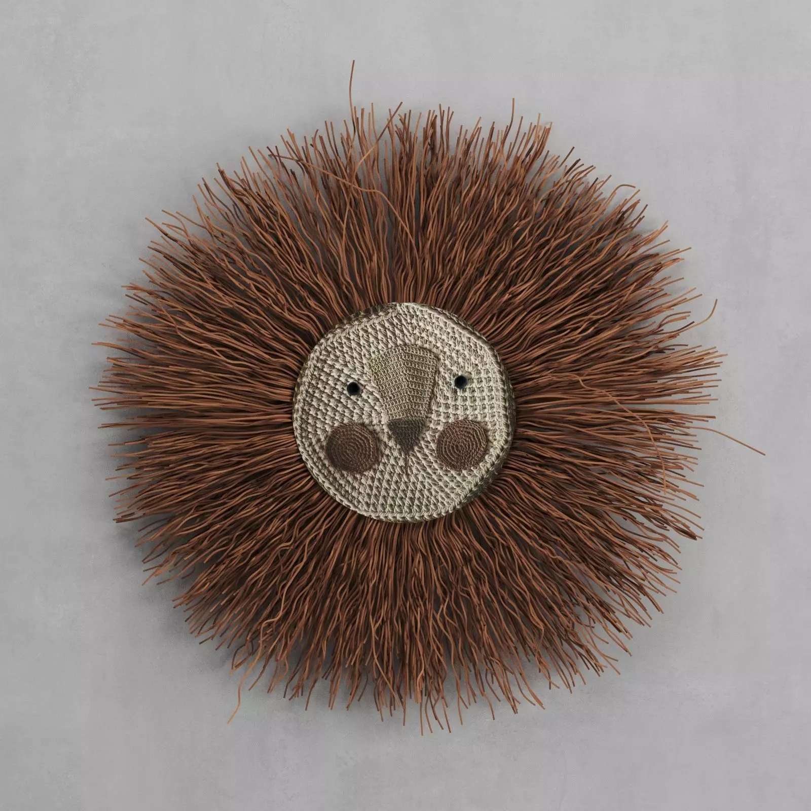 3D model of a hanging handmade crochet / knit wall decoration, made by Ila y Ela. Mesh is a simple UV mapped object with hair and fur modifier applied for the lion mane. Turbosmooth si enabled in render mode. No post-process was done on the preview images.