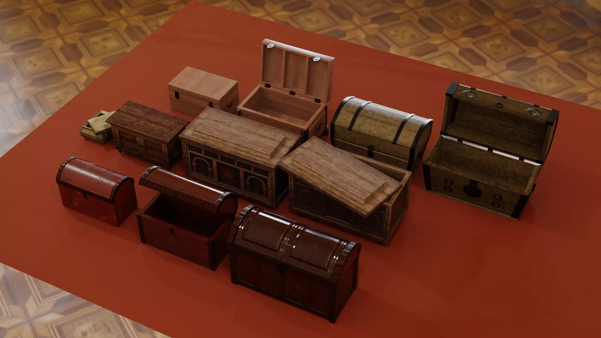 10 chests and coffers with different levels of detail, all lowpoly (596 - 5604 polygons).