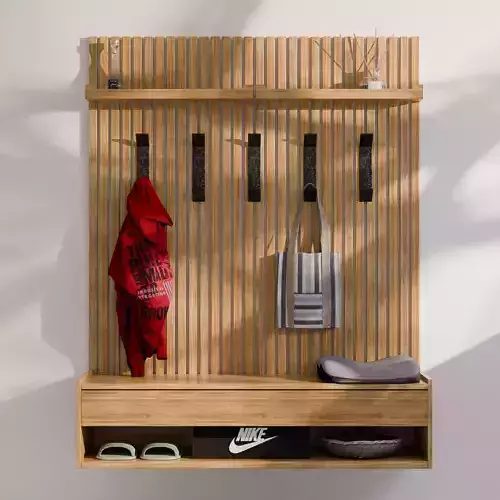 Sleek Batten Design: The centerpiece of this set is the beautifully crafted panel featuring a series of vertical white oak battens. This design not only adds a sophisticated textural element but also creates a sense of visual height and spaciousness.Integrated Shoe Storage Bench: The robust storage bench provides a comfortable seating area while offering ample space to neatly organize your footwear. The lower compartment is perfect for storing shoes, keeping them out of sight and off the floor.Versatile Upper Panel: The upper panel is equipped with sturdy, matte black hooks, ideal for hanging coats, scarves, and bags. The integrated shelving at the top provides a space for decorative items, keys, or other essentials, allowing for personalized styling.Premium White Oak Construction: Crafted from high-quality white oak, this set boasts durability and a timeless esthetic. The natural wood grain adds warmth and character, making it a focal point in any interior.Modern Minimalist esthetic: The clean lines, minimalist design, and neutral color palette seamlessly blend with various interior styles, from Scandinavian and contemporary to mid-century modern.Optimized for Organization: This set is designed to maximize space and minimize clutter. It provides a dedicated spot for everything you need as you come and go, ensuring a tidy and organized entryway.Realistic Detailing: The 3D model is meticulously crafted with attention to detail, including accurate wood grain textures, realistic hook designs, and precise joinery. This ensures a high level of realism in your renders.Ready for Rendering: The model is optimized for rendering with popular software, featuring clean topology, UV unwrapping, and high-resolution textures.