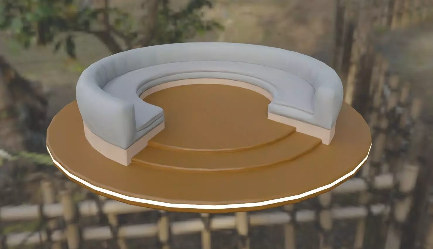 A circular conversation sofa that sits on a platform. Inspired by a conversation pit, but in a more modern twist and inverted depth. Platform has an LED strip around it.