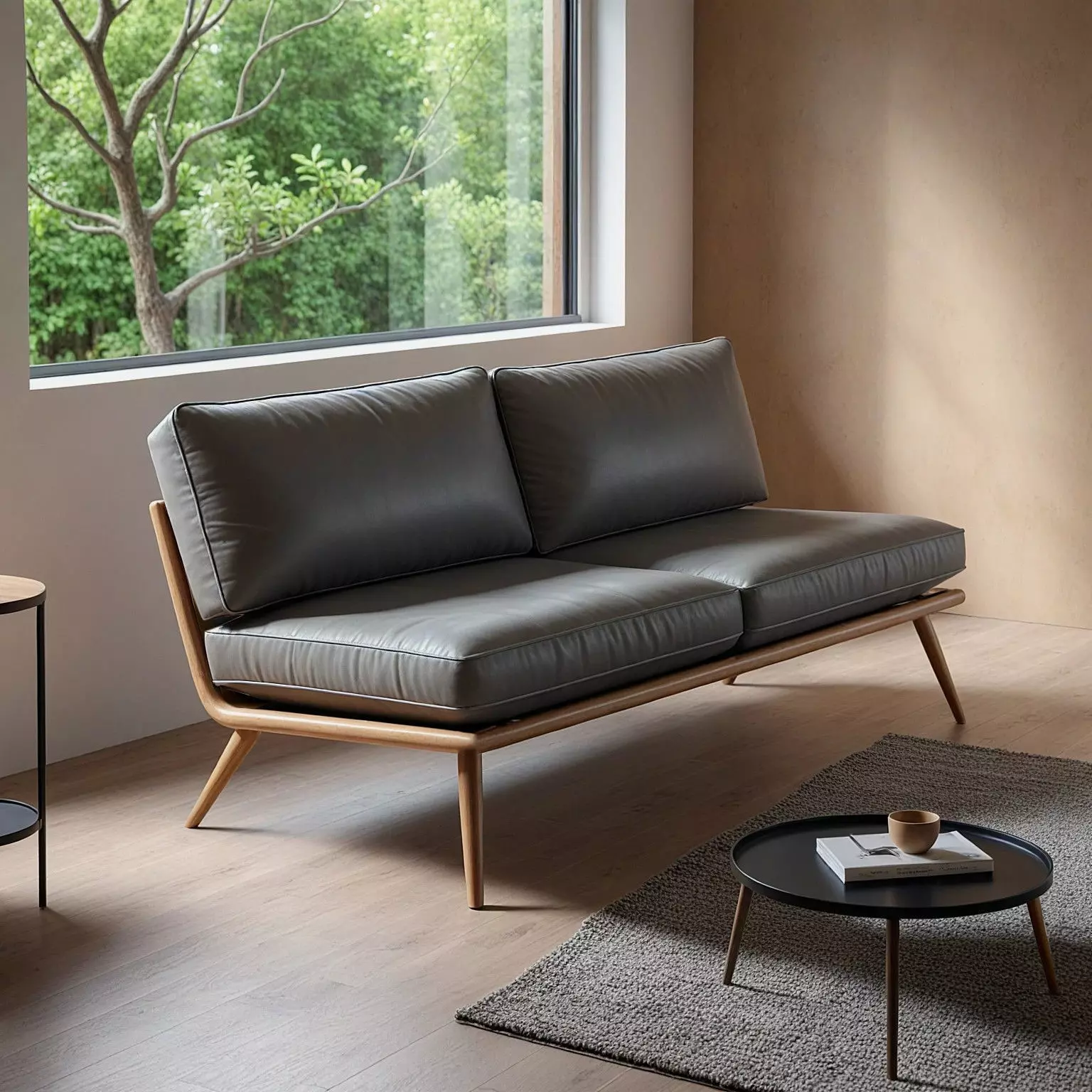 This is a minimalist Scandinavian-style sofa featuring a refined wooden frame that exudes a warm, natural texture. The sofa's design is simple and elegant, complemented by soft deep-gray leather cushions for both comfort and modern aesthetics. The slender solid wood legs add a sense of lightness and enhance the overall openness of the space. This sofa is an excellent choice for interiors with a natural and minimalist theme.