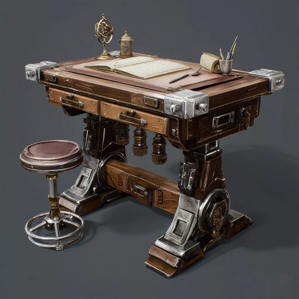 A detailed stylized fantasy work table, perfect for workshops, алхимия, crafting stations, or medieval interiors.The model features rich materials like wood and metal, along with small props such as books, tools, and decorative elements to enhance realism and storytelling.
