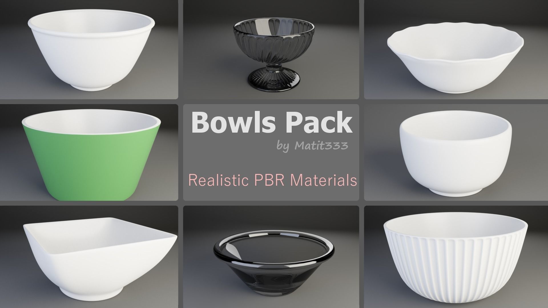 Polygon counts: (2 subdivisions)Bowl_01 - 2 272Bowl_02 - 1 632Bowl_03 - 1 888Bowl_04 - 7 904Bowl_05 - 3 184Bowl_06 - 30 464Bowl_07 - 1 504Bowl_08 - 31 232