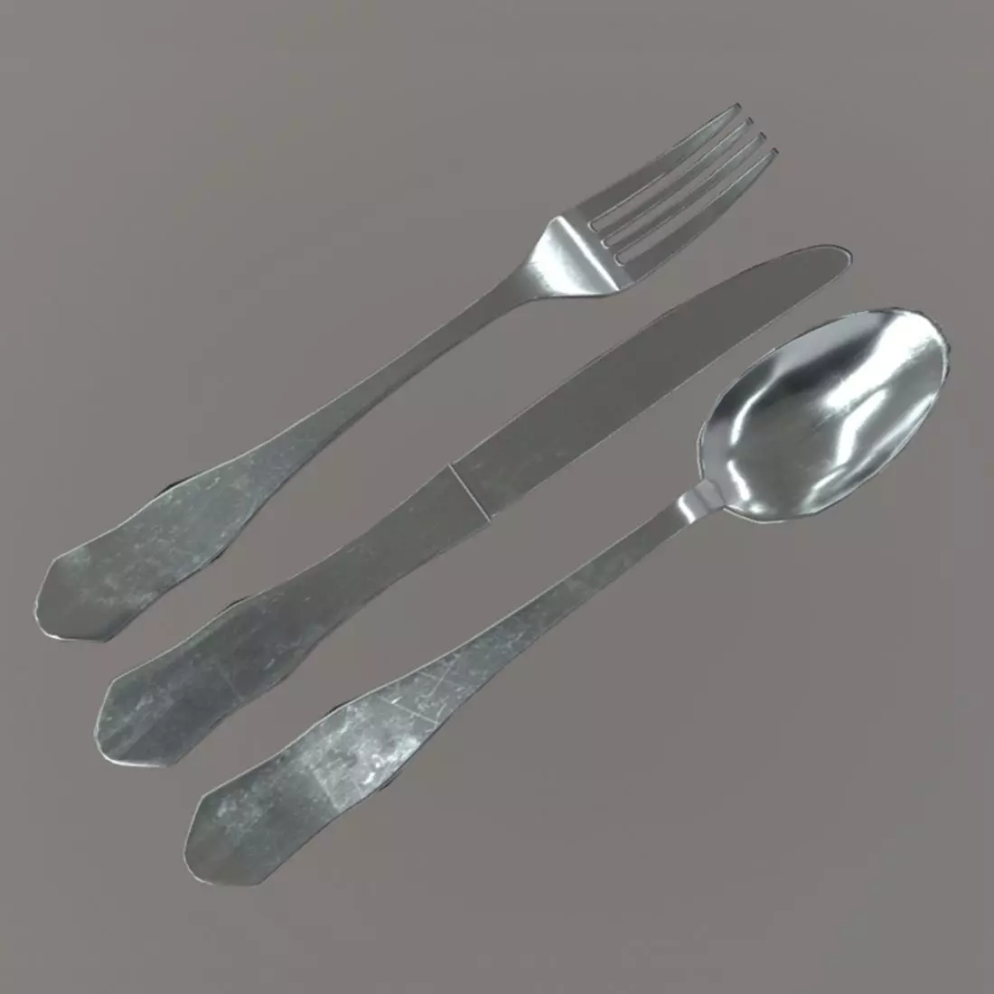 Standard Cutlery set, it comes with a fork, knife and a spoon. It is low poly, so it is gameready.