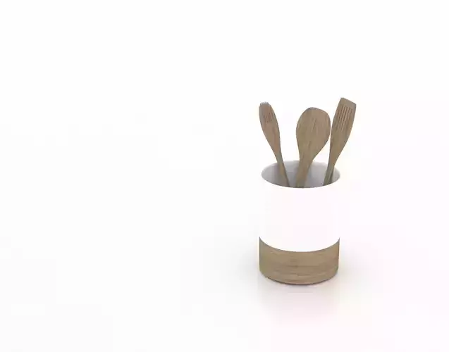 Sleek wooden and ceramic utensil holder with 3 wooden utensils. Created in 3Ds MAX. Images seen are rendered in VRAY. 1 Texture map for the wood. 2 Materials