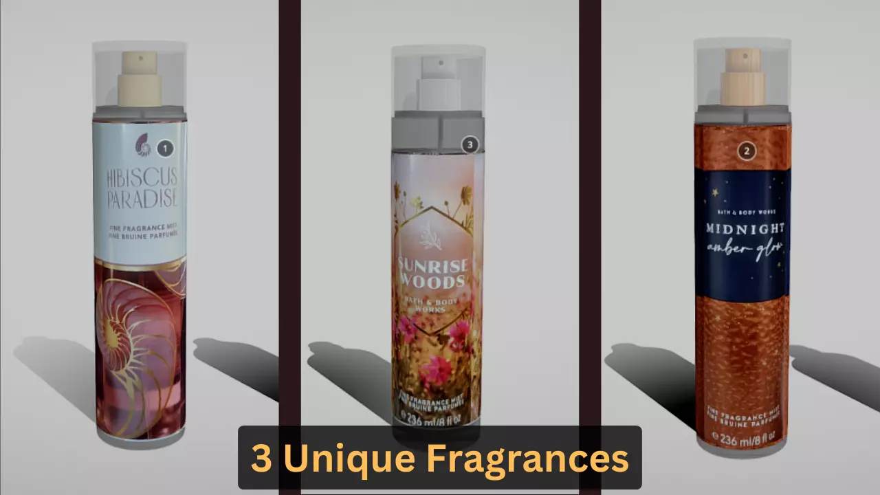 Step into the world of Bath & Body Works with this detailed 3-piece perfume set - featuring Midnight Amber Glow, Sunrise Woods, and Hibiscus Paradise. Each bottle is modeled to reflect the unique personality of its signature scent: