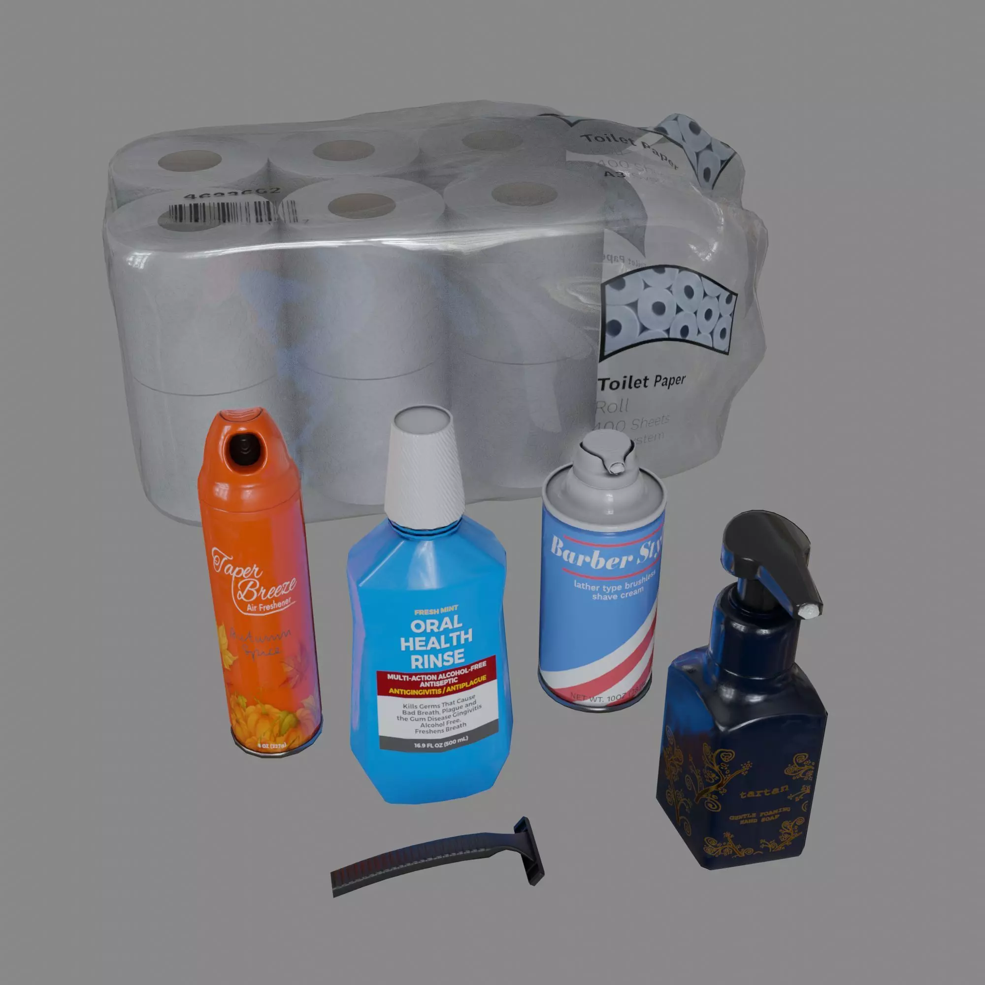 A bottle of mouthwash, a can of scented air spray, a cheap disposable razor, a can of shaving cream, a bottle of hand soap, and a mostly full pack of toilet paper. Includes SVG files for all labels.
