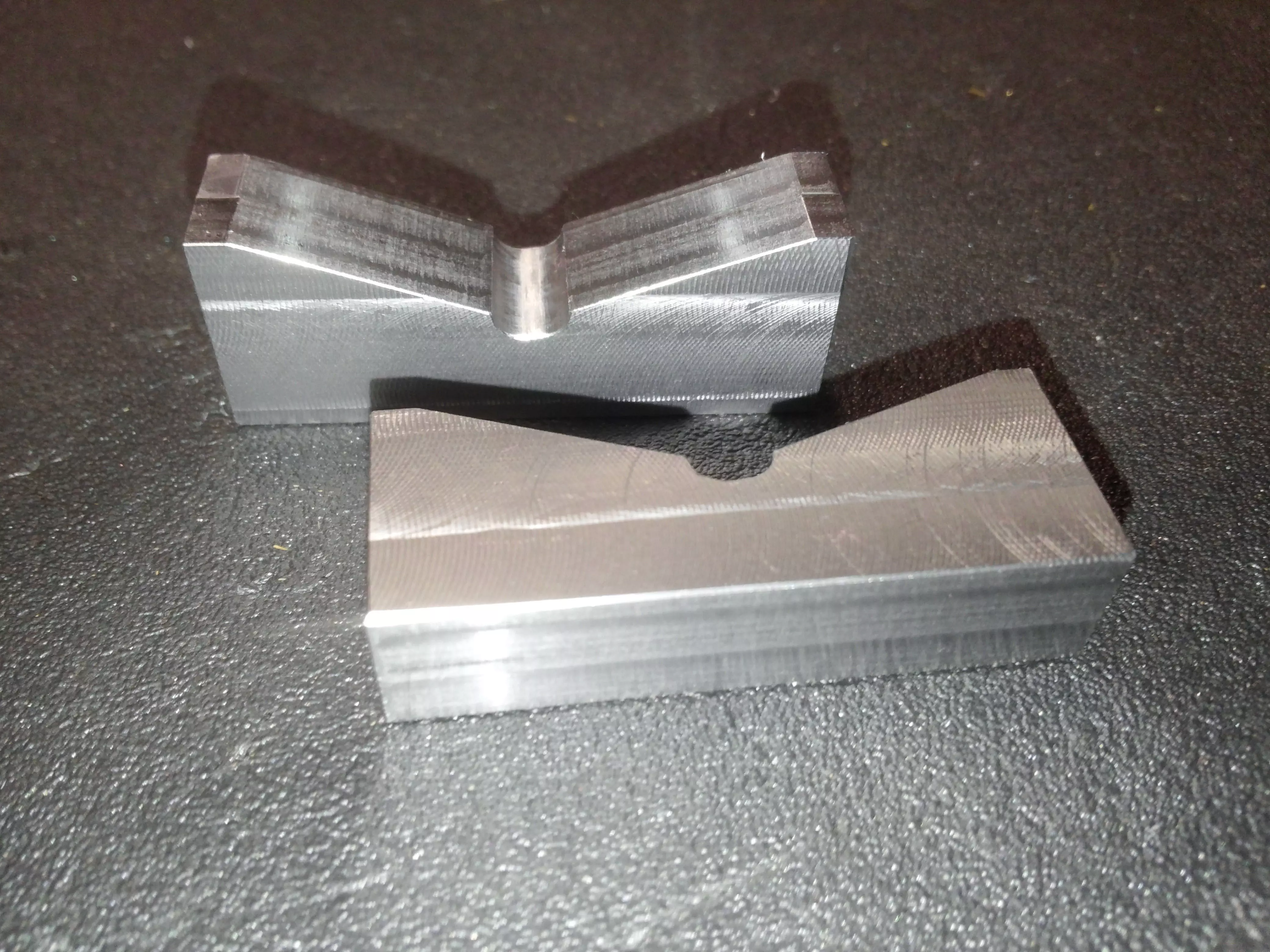 This is a simple v-block that my grinder hand is going to grind in for me. There is a mastercam file as well as an UNPROVEN nc file written for my Haas VF-6. Will update this with a proven nc file in anyone needs it, so let me know. This little dude is going to save me some serious set up time, so I am doing a matched pair. Clamps are coming later on. This is to hold a 1.95in OD part that gets a pair of 20 degree flats on each side, then a counterbore to hold a dowel in place, one on each side. SO... we set up our stop and flip and flip and done. Call it a day, figuring about 35 parts in an hour and a half that requires plus/minus a degree accuracy. The nc file should take about 20 minutes to run, but feel free to be more aggressive! Have fun...