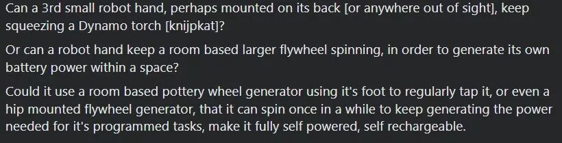 Can a 3rd small robot hand, perhaps mounted on its back [or anywhere out of sight], keep squeezing a Dynamo torch [knijpkat]? Or can a robot hand keep a room based larger flywheel spinning, in order to generate its own battery power within a space, when both are perfectly adapted to have done so?