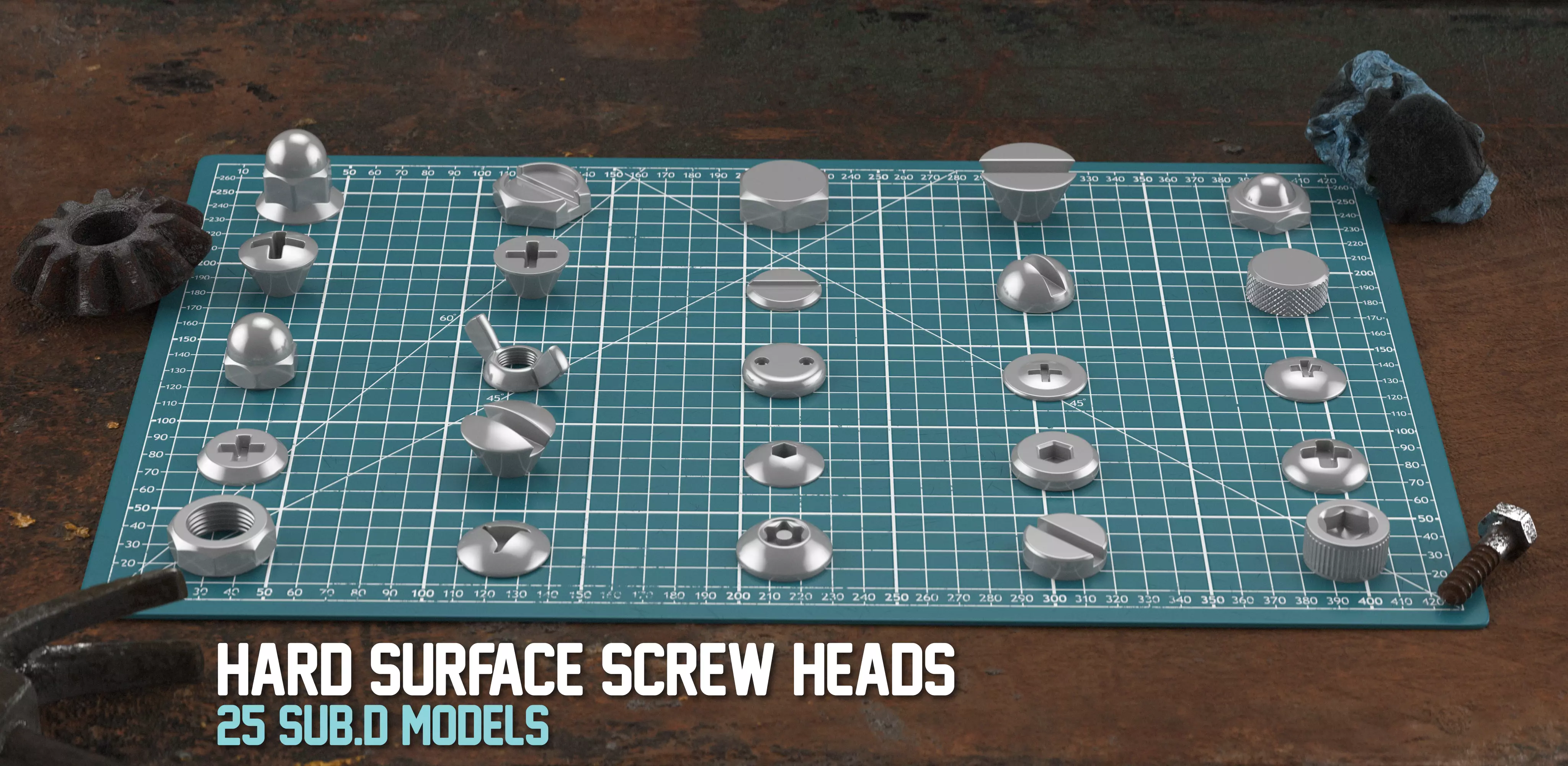 !Disclaimer ! This pack does not includ the decoration in the preview images, only the Screw Heads in the green Mat is included in the pack.