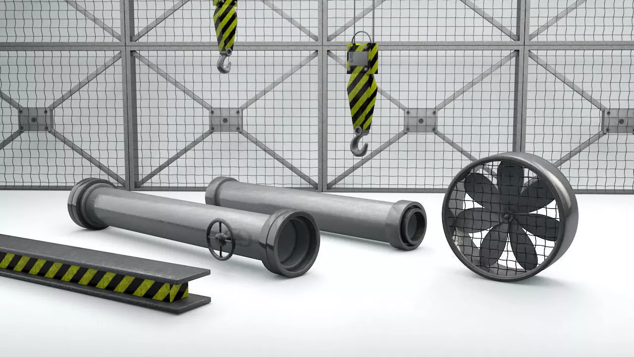 A set of: Blowing Fan Crane, Water Pipe with Key, Water Pipe Extension, Wired Window, Construction Metal Support.
