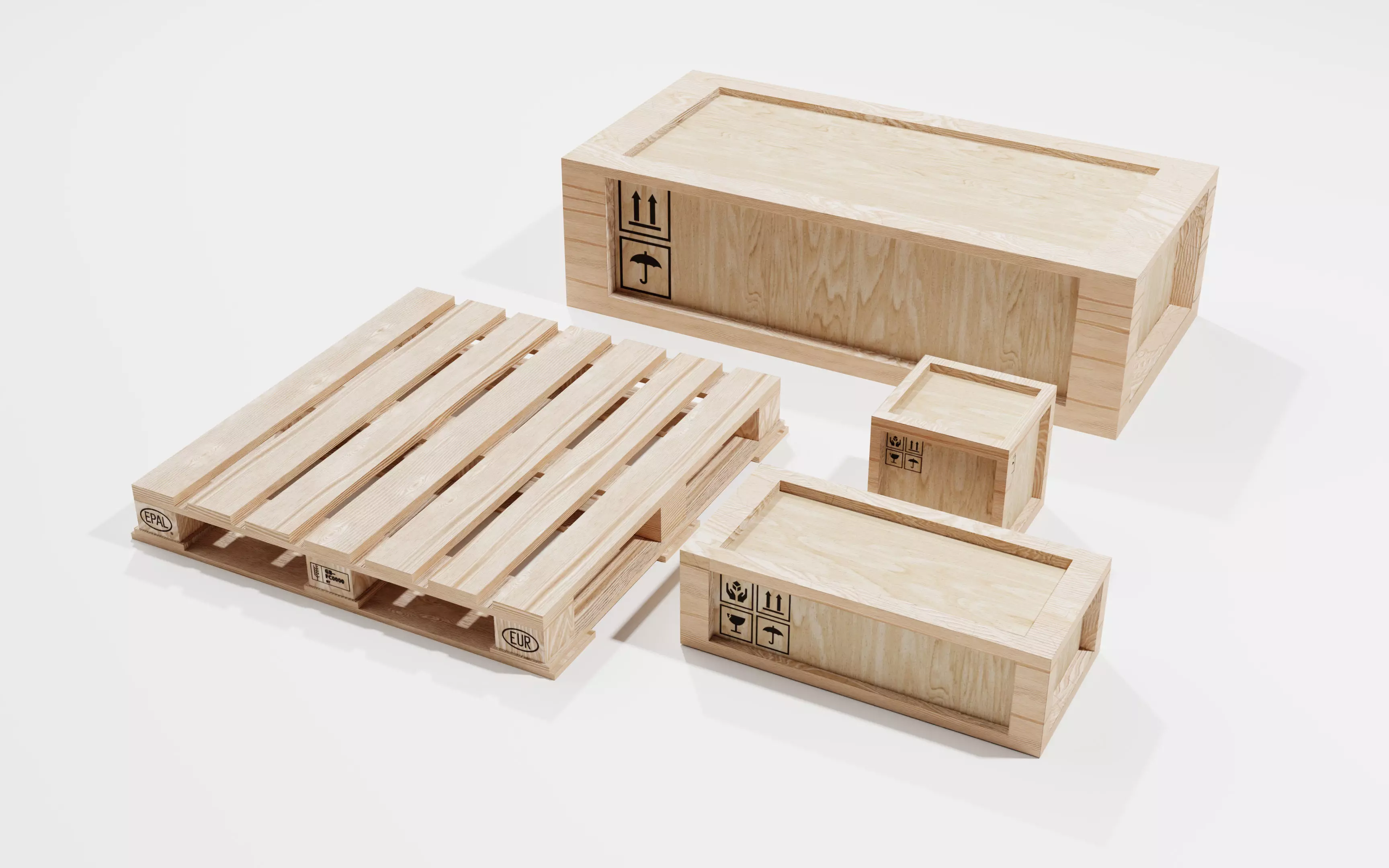 3D model of Generic wooden boxes and a pallet wich can be used for transport. The model has been made in blender and is very low poly with only 384 polygons. Custom logo's can be added with the psd. file.