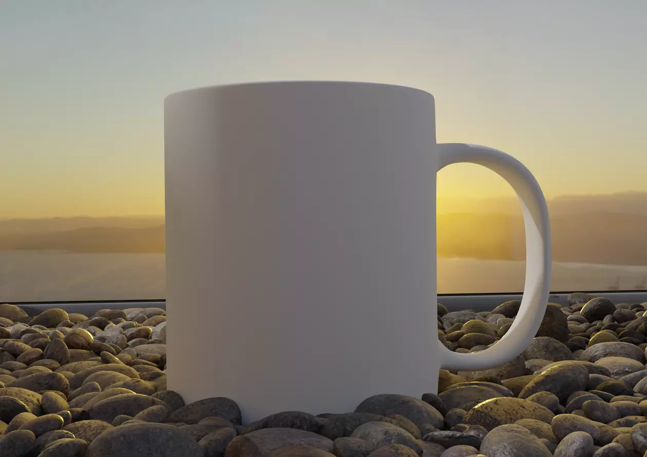 The scene is designed with a professional lighting setup (HDRI/Environment) that mimics a warm sunset, providing soft shadows and realistic reflections on the mug’s surface.