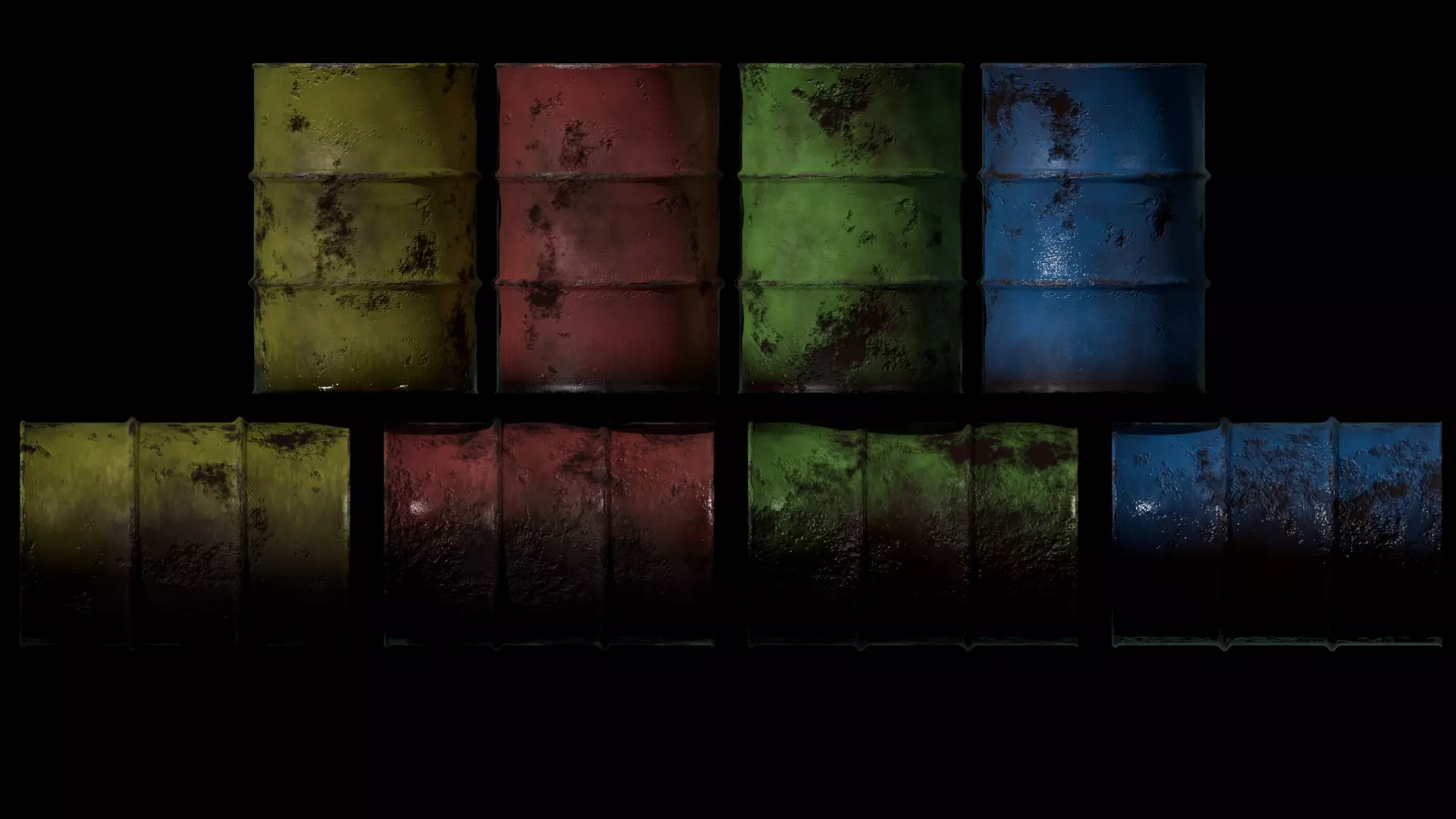This is a high-quality, realistic game-ready rusty metal barrel asset pack including multiple color and variation options.
