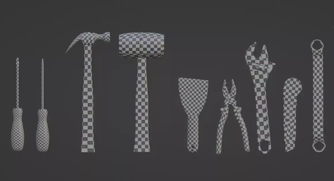 Some models, like the pliers and spanner, have minor issues with overlapping geometry due to incomplete unwrapping (unwrap and overlap issues).