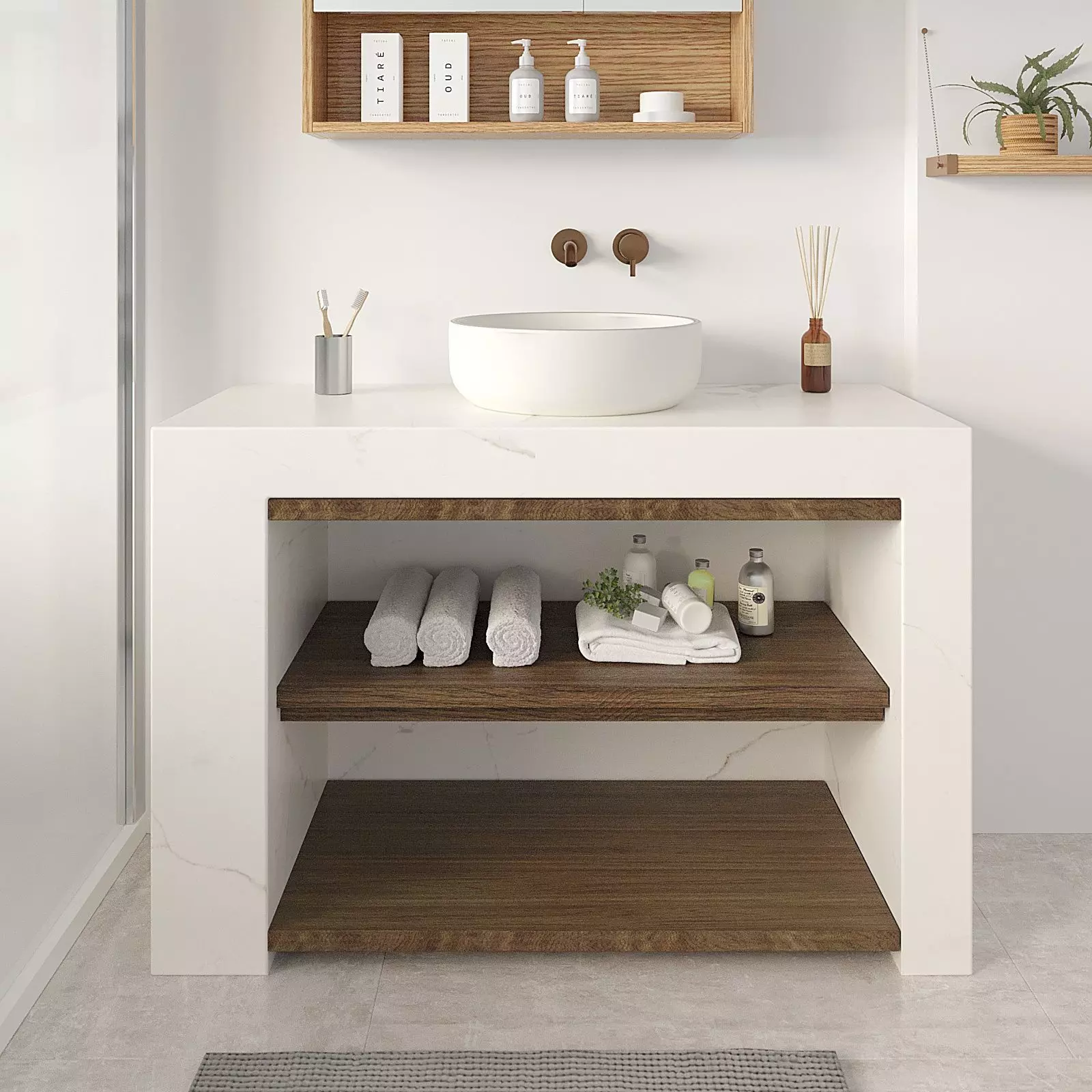 3D model of a modern bathroom vanity unit composed of an open shelf cabinet and a bowl sink with tap, in wood and white carrara marble materials. Mesh is high poly, mainly based on quads, smooth and clean. Model is ready to be used in close-up product visualisation or archviz projects.