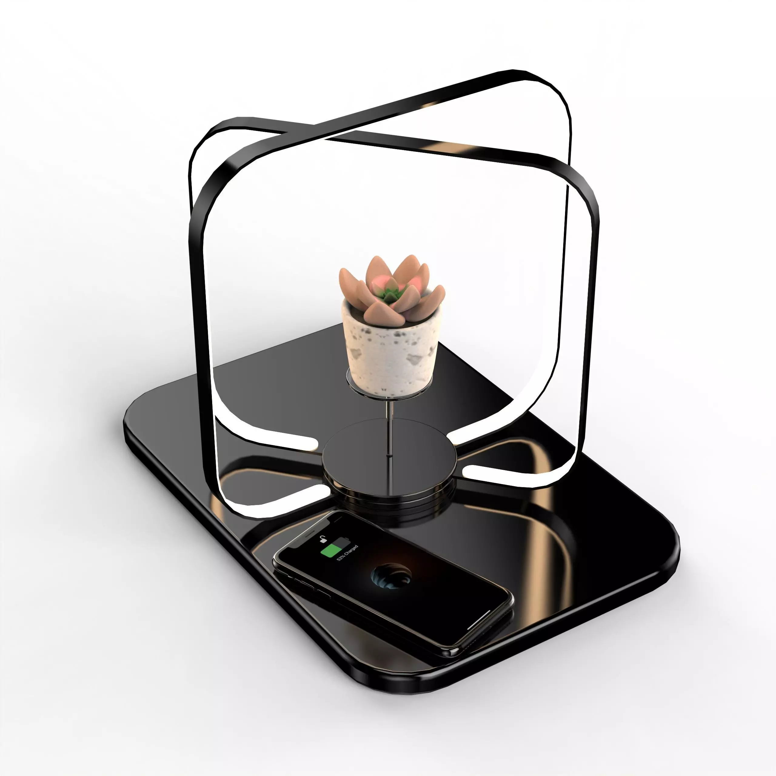 This is a rotating bed side table lamp for a modern bedroom.It has a display piece space in the middle where one can put anything.The base doubles as a wireless charging pad for ones mobile.