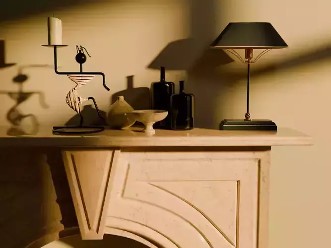 This render showcases a sophisticated arrangement of decorative elements placed on a marble fireplace mantel in a warm cream tone. The centerpiece is a stylish metal candleholder shaped like a human silhouette with a unique texture and a candle on top. Nearby, a natural-toned ceramic vase, an elegant bowl, two sleek black bottles, and a classic table lamp with a metal base and a dark lampshade complement the scene. Warm lighting and soft shadows emphasize the textures of the objects, creating a cozy and inviting atmosphere.