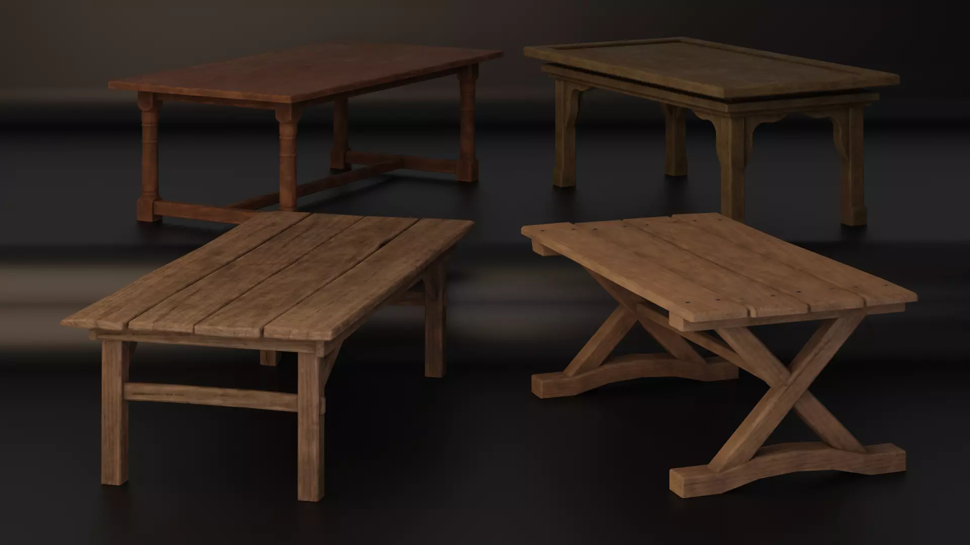4 Medieval Wooden Tables perfect for your fantasy, rpg, strategy or other medieval games or projects. Modeling with blender, texturing with Substance Painter. Ewery Pice has an continuous Wood Grain Texture.