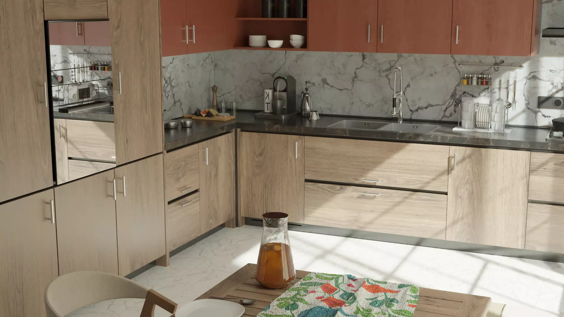 The dining table, made of the same wood as the kitchen cabinets, continues the cohesive look, with a colorful and playful table runner that introduces a lively touch to the otherwise neutral palette. The glass jug filled with orange tea, along with the placed dishes and cutlery, enhance the inviting, homely ambiance of the dining setup.