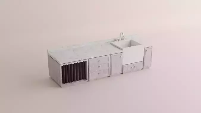This meticulously designed 3D kitchen countertop model features a sleek marble-like surface, perfect for modern interior aesthetics. The countertop includes a built-in sink with a polished faucet, seamlessly integrated for functionality and style. Light wood-finish drawers and cabinets, equipped with metallic handles, provide ample storage solutions, while a vertical divider on the left is ideal for storing cutting boards or baking sheets. The realistic detailing of this model, from the grain of the cabinetry to the smoothness of the countertop, makes it an excellent choice for interior design visualizations, architectural renderings, or virtual home staging projects.