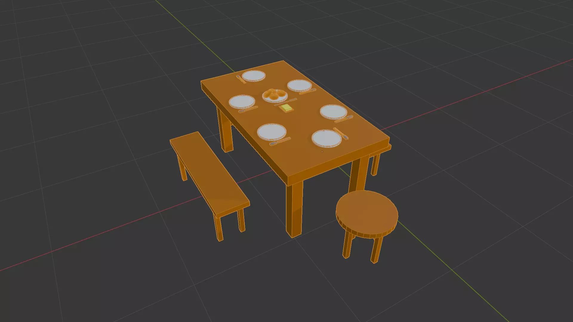 This high-quality 3D model features a modern and minimalist dining area set, including a rectangular dining table, a bench, three round stools, and detailed table settings. The model comes with plates, cutlery, butter, and bread as realistic decorations. Perfect for interior design projects, renderings, or game assets.