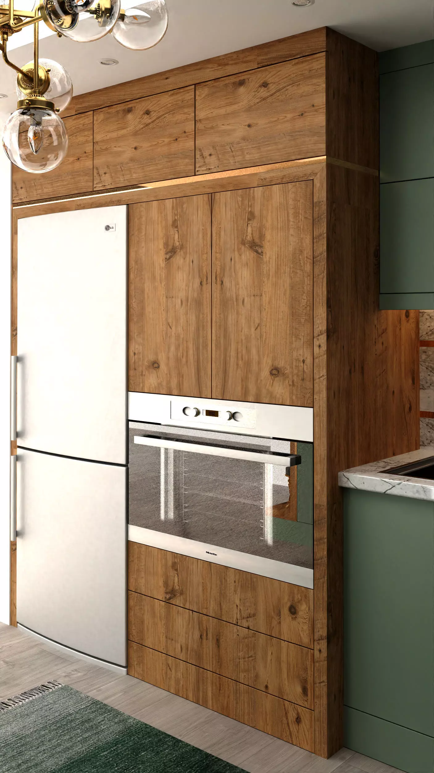 Modern Kitchen Cabinet: Fusion of Wood Texture and Green Elegance