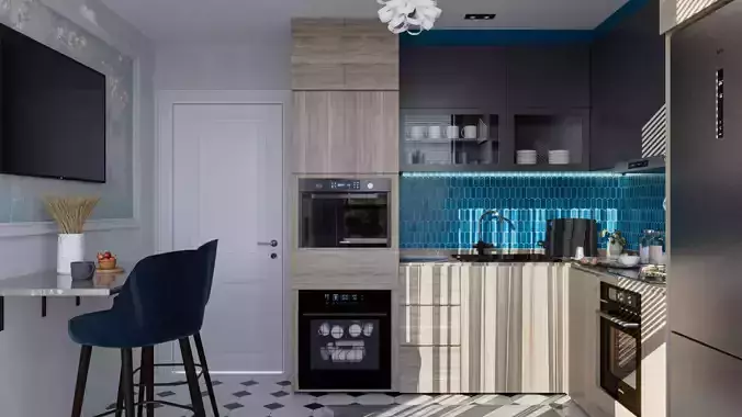 This high-quality 3D model presents a sleek, modern kitchen interior designed specifically for narrow or compact living spaces. The design successfully merges aesthetics and functionality to create a visually spacious and contemporary look within a limited area. It is perfect for architectural visualization, interior design projects, and high-end rendering portfolios.