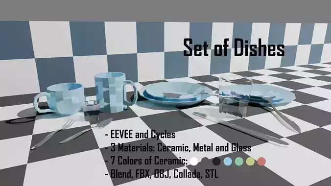 Set of low-poly dishes and cutlery in 4 composition examples that will fill the void on tables, in cabinets and cupboards. Made in Blender 4.2.2 LTS